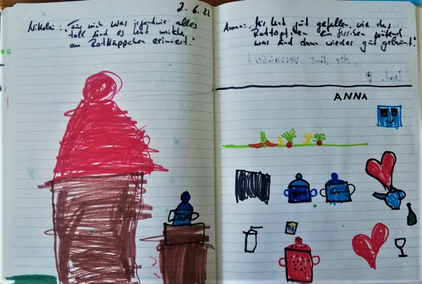 "Liebe Denise! Das Theaterstück hat uns viel Freude bereitet. Danke, dass wir Rottöpfchen, den Wolf, die Großmutter, den Wald, die Wolken... anfassen durften! Die Kinder aus der Kita Herz - Jesu in Osnabrück" Juni 2022